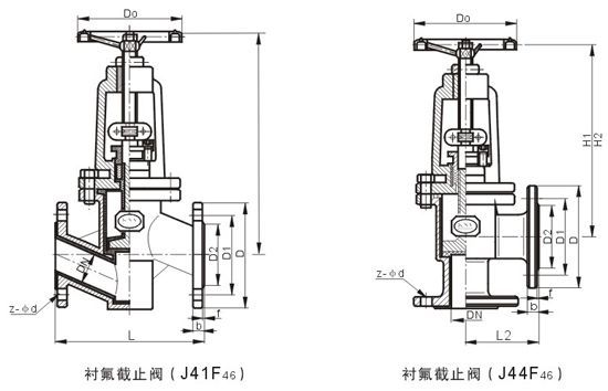 J44F46 角式衬氟截止阀适用在-50~150℃的各种浓度的王水、流酸、盐酸、氢氟酸和各种有机酸、强酸、强氧化剂,还适用于各种浓度的强碱有机溶剂以及其它腐蚀性气体,液体介质的管路上使用.J44F46衬氟角式截止阀是指关闭(阀瓣)由阀杆带动并沿阀座中心轴线做升降运动的阀门,在管路上主要用来接通或截断管路中的介质,但不能做节流用。