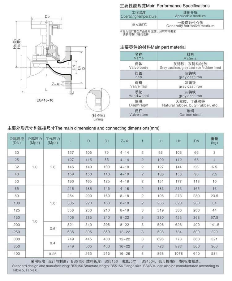 EG41J-10 英标衬胶隔膜阀适用于轻重工业及楼宇管道。流体前进的道路上,隔膜阀可应用于:化工、石化、石油、造纸、采矿、电力、液化气、食品、制药、给排水、市政、机械设备配套、电子工业,城建等领域。
