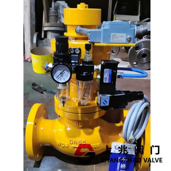 QDQ421F 气动91黄瓜视频污是采用活塞式气动执行器,为弹簧复位常闭型切断阀气缸的进气方向装有易熔塞,气源压力为0.4~0.7Mpa。气动91黄瓜视频污可以配电磁阀、气源减压阀、行程开关,目的是为了远程能有效的控制阀门的情况,在必要时采取断电或断气达到紧急切断作用,气动91黄瓜视频污所配的易熔塞是为了环境温度到达易熔塞最高熔点时自动熔化达到气缸里的压缩迅速排放使弹簧快速切断阀门。气动91黄瓜视频污可用于液氨、液化石油气、天然气、氮气、沼气等易燃气体或液体的管道。